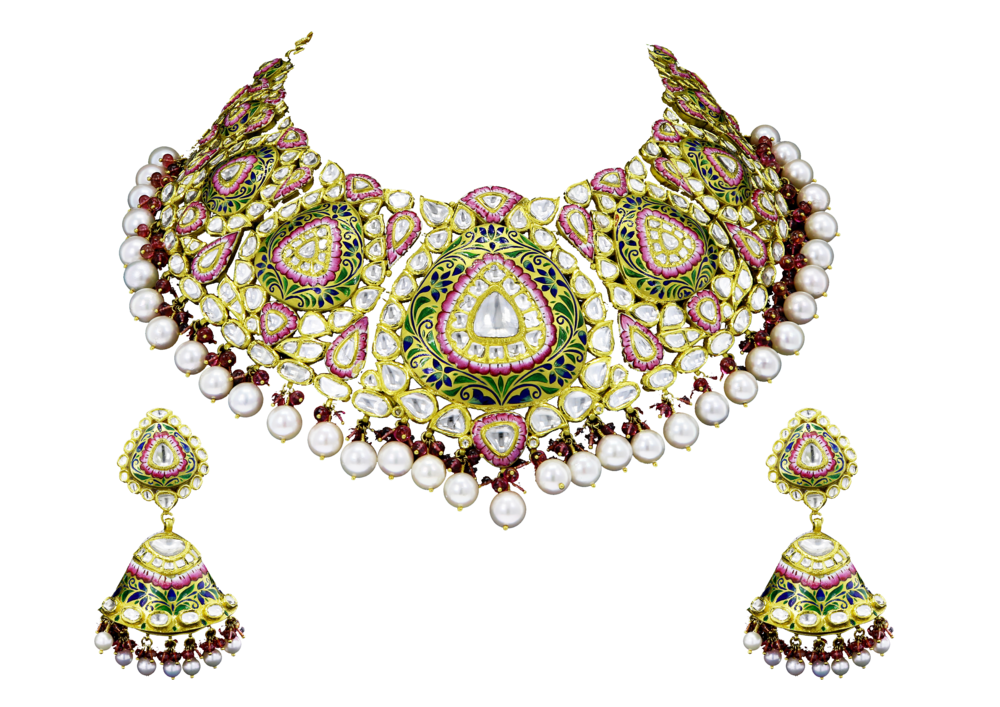 Mounted in 22k yellow gold with diamond polki and enamel.