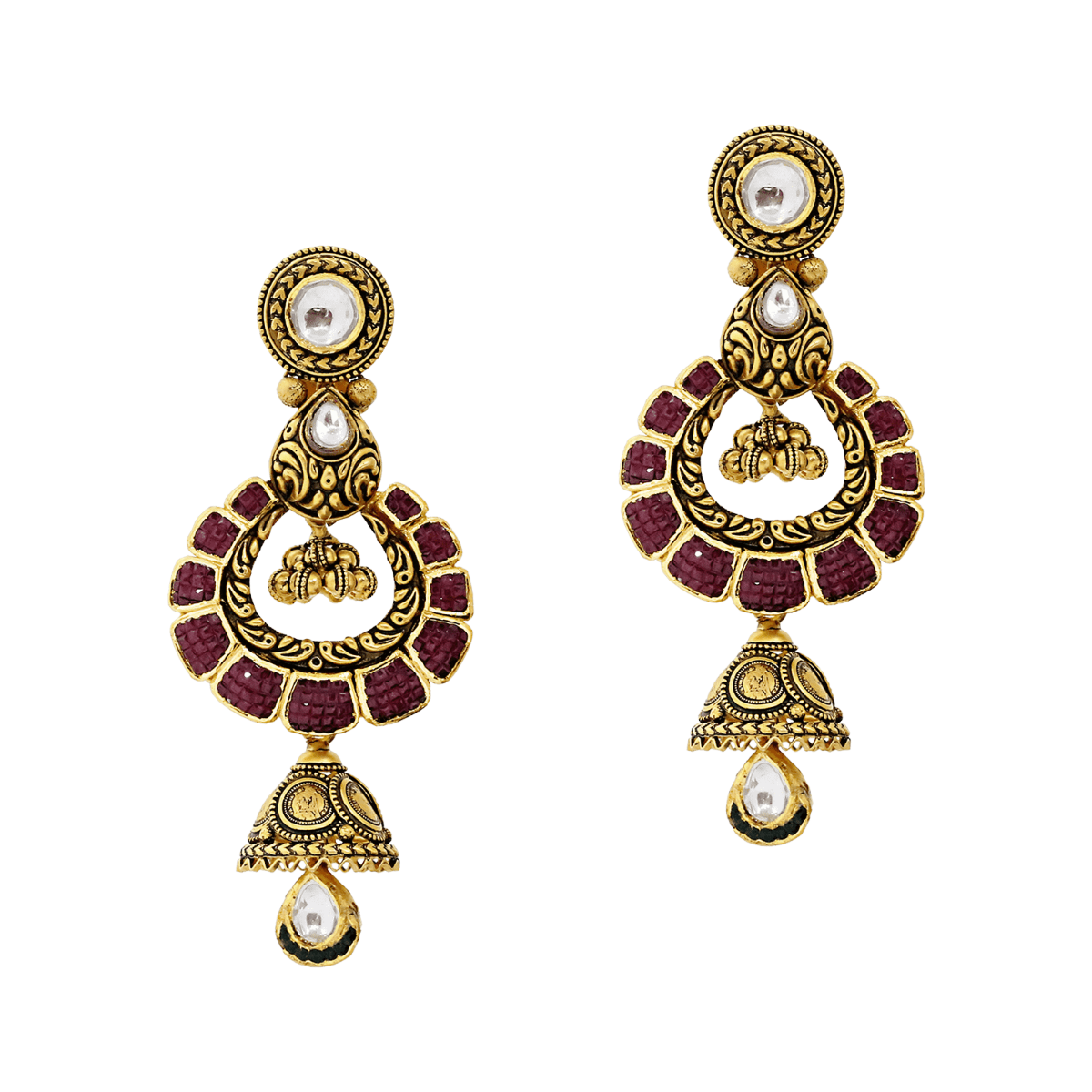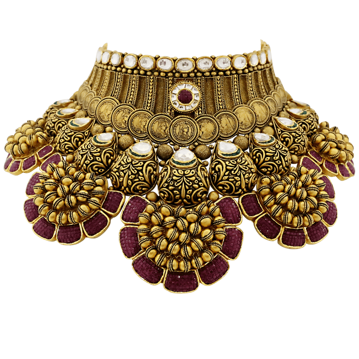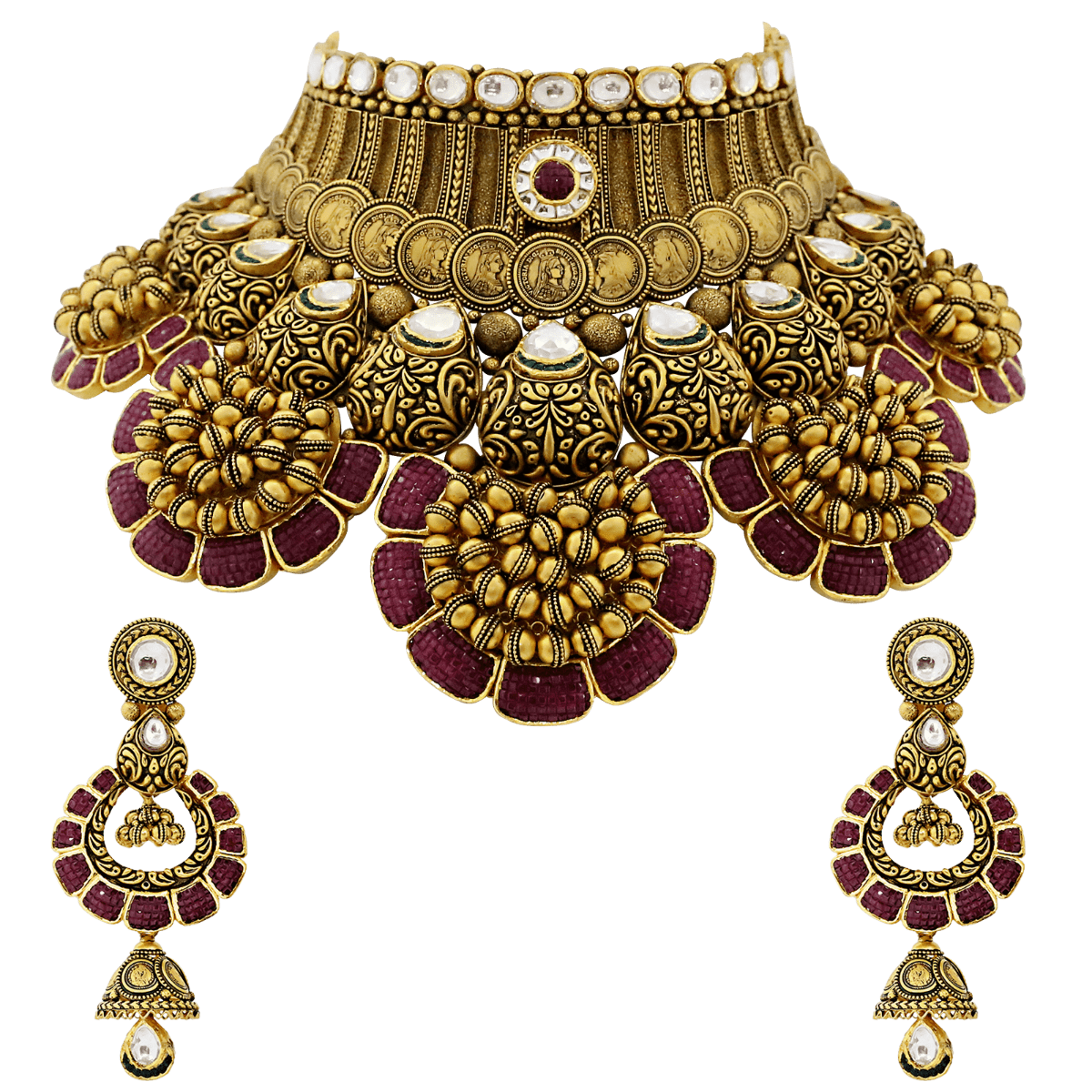 Bridal Gold Necklace Set With Red Stones & Coin Motif
