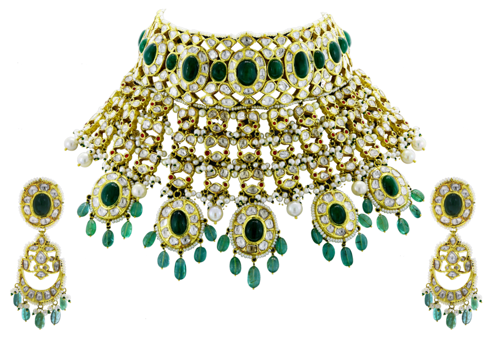Mounted in 22k Yellow gold with diamond polki and precious stones.